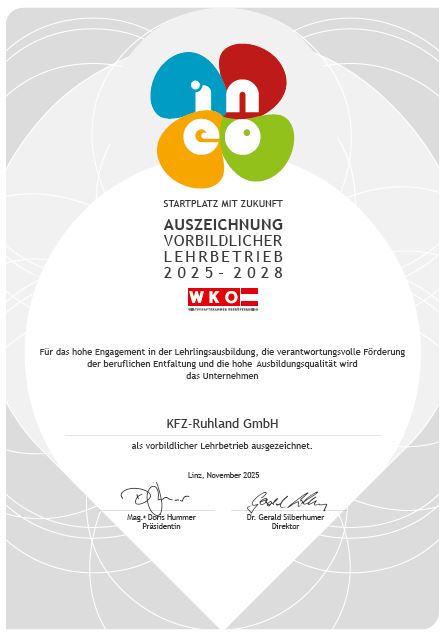 Wir sind stolz darauf, von der WKO Oberösterreich als vorbildlicher Lehrbetrieb 2025–2028 ausgezeichnet worden zu sein.